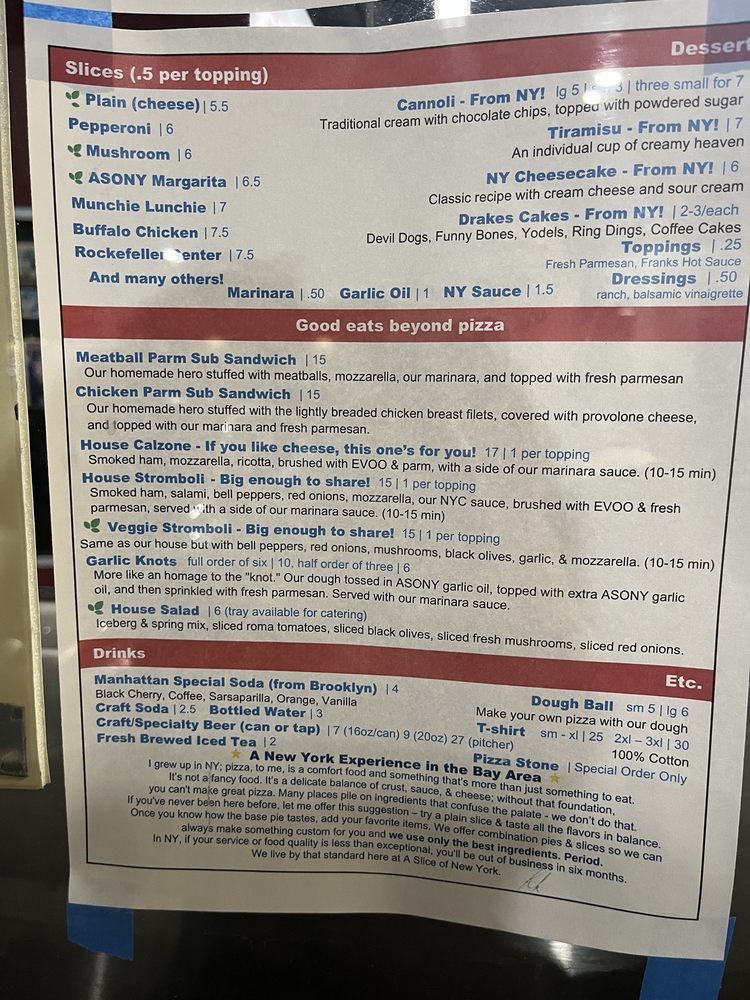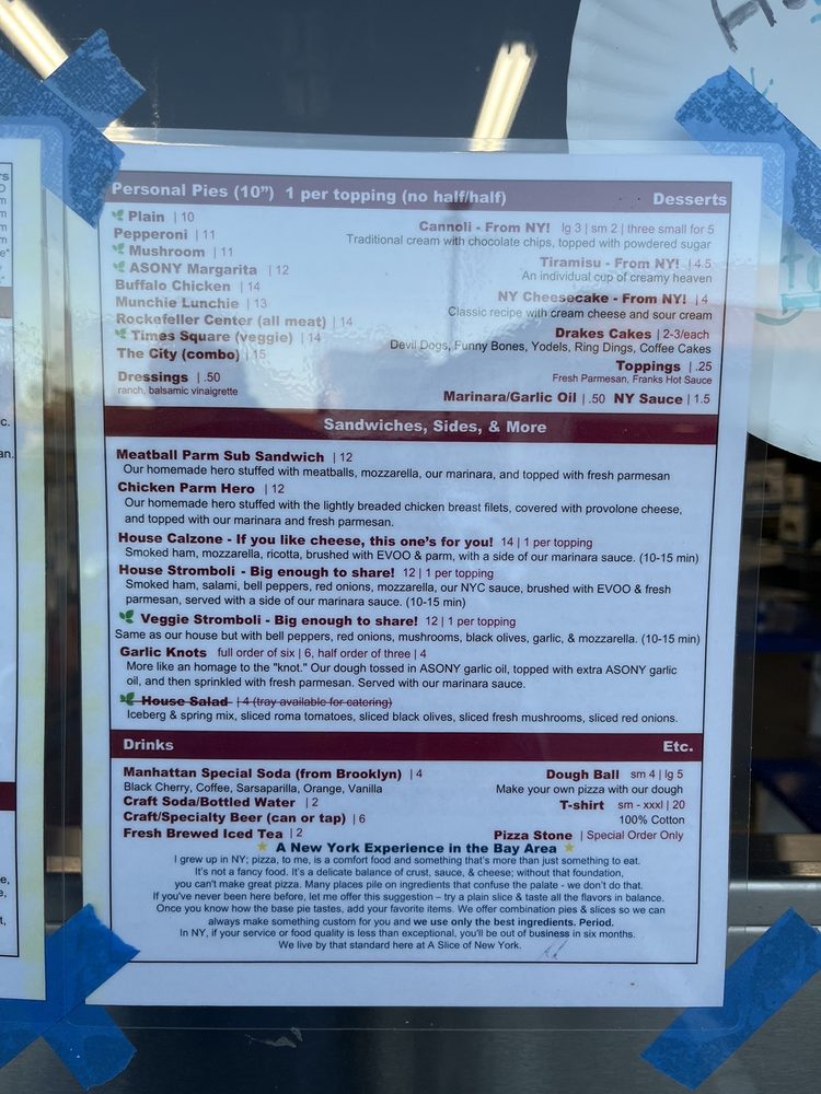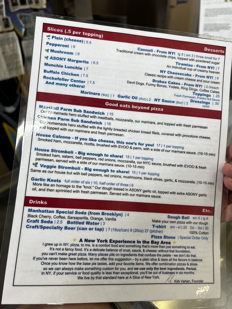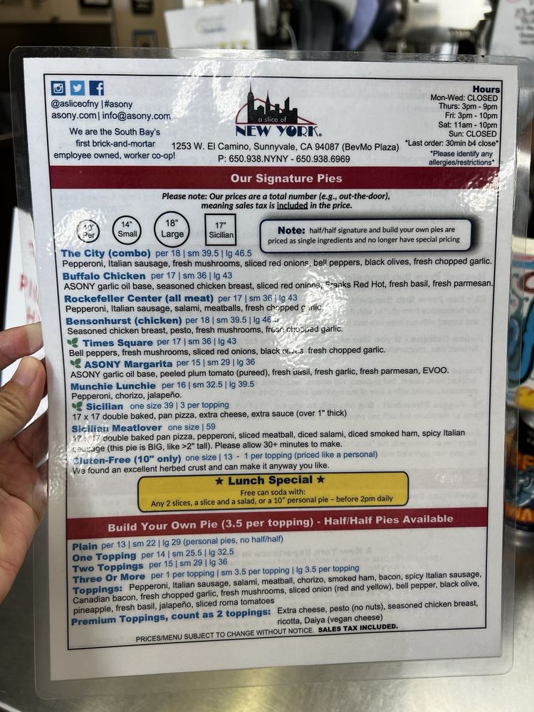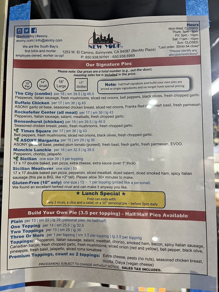Introducing the menu at A Slice of New York, located in Sunnyvale, CA, offers a wide range of options including vegan and vegetarian choices. With a casual atmosphere, this Asian-owned establishment provides wheelchair accessibility, free Wi-Fi, and accepts various payment methods, including cryptocurrency. Customers rave about the delicious thin crust pizzas, flavorful toppings, and must-try garlic knots. The friendly staff and prompt service create a welcoming environment for diners looking to enjoy a slice or a full meal. Whether dining in, ordering for delivery, or taking advantage of their catering services, A Slice of New York aims to satisfy all pizza cravings with their quality ingredients and unique flavors.