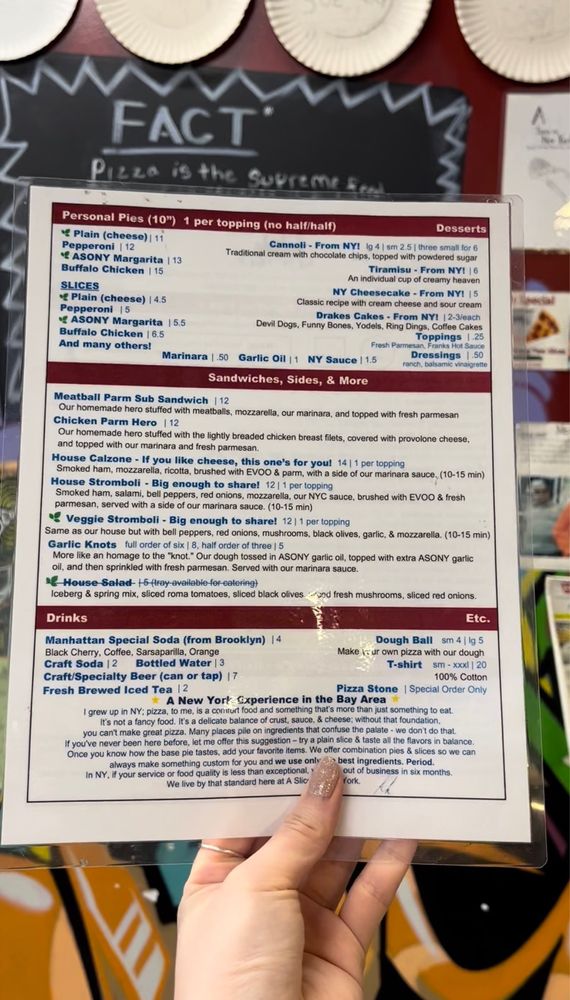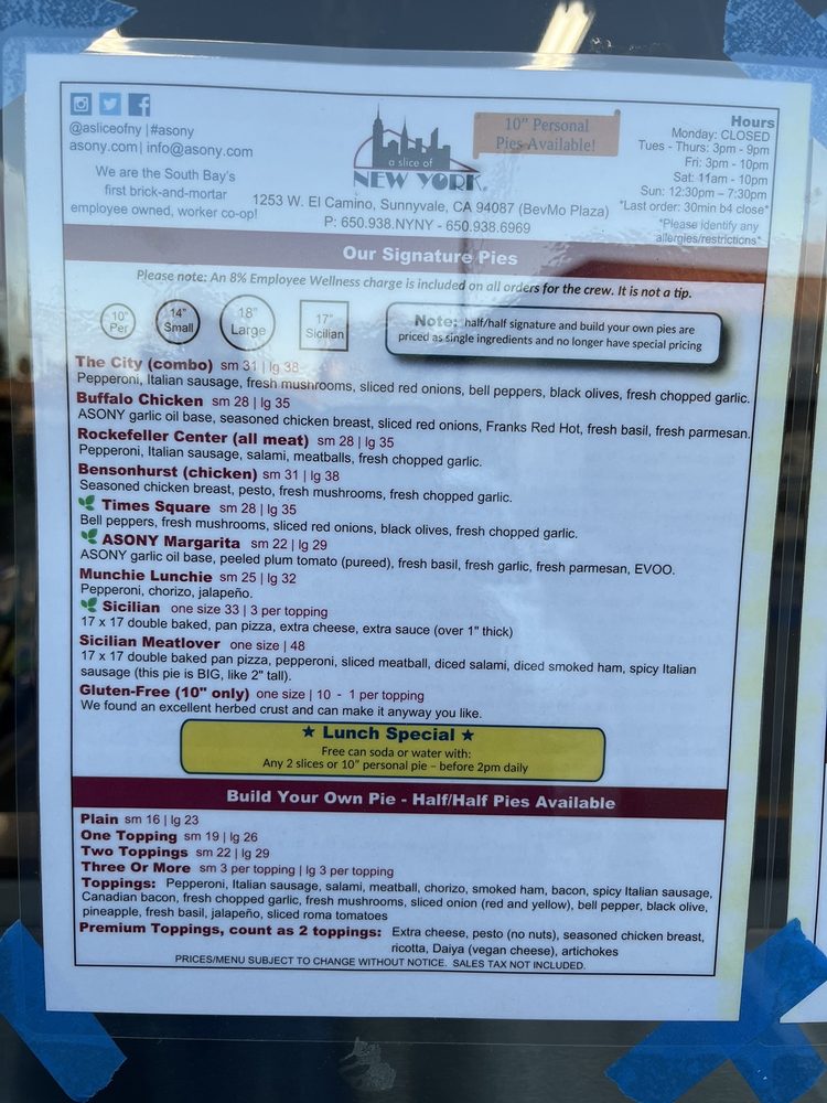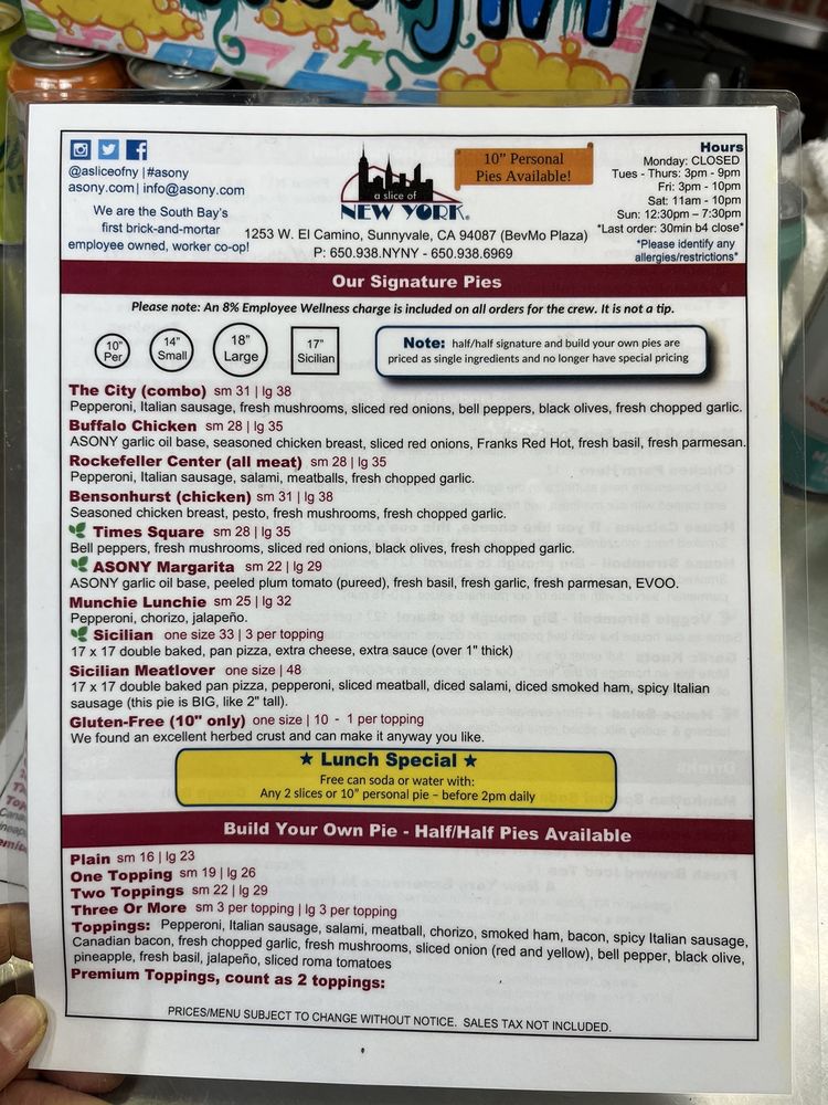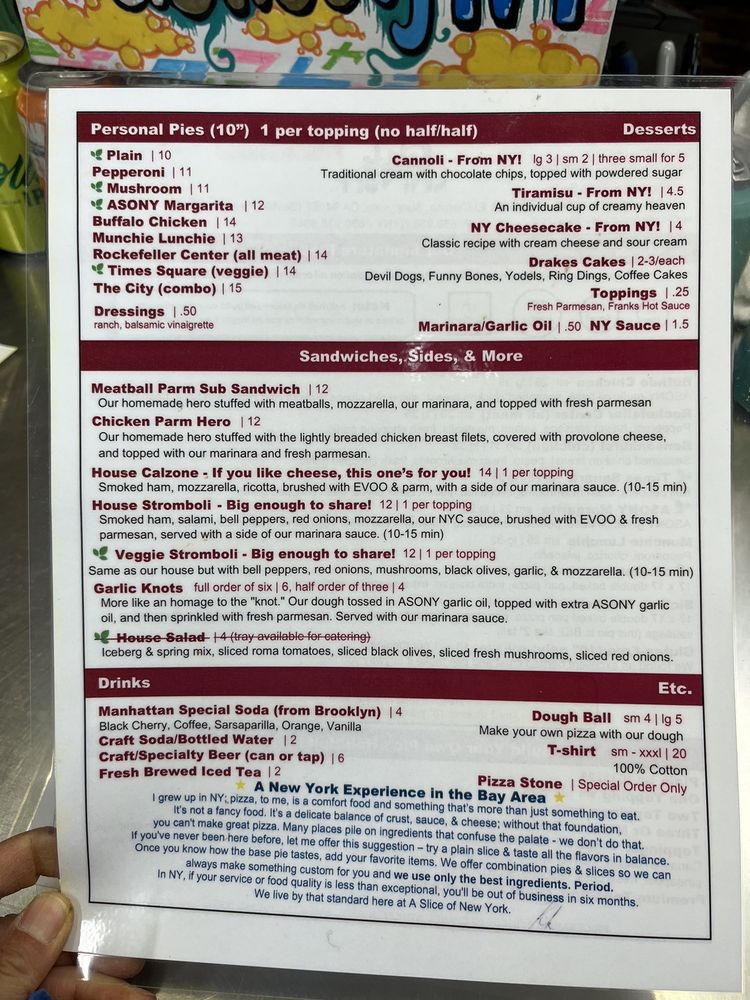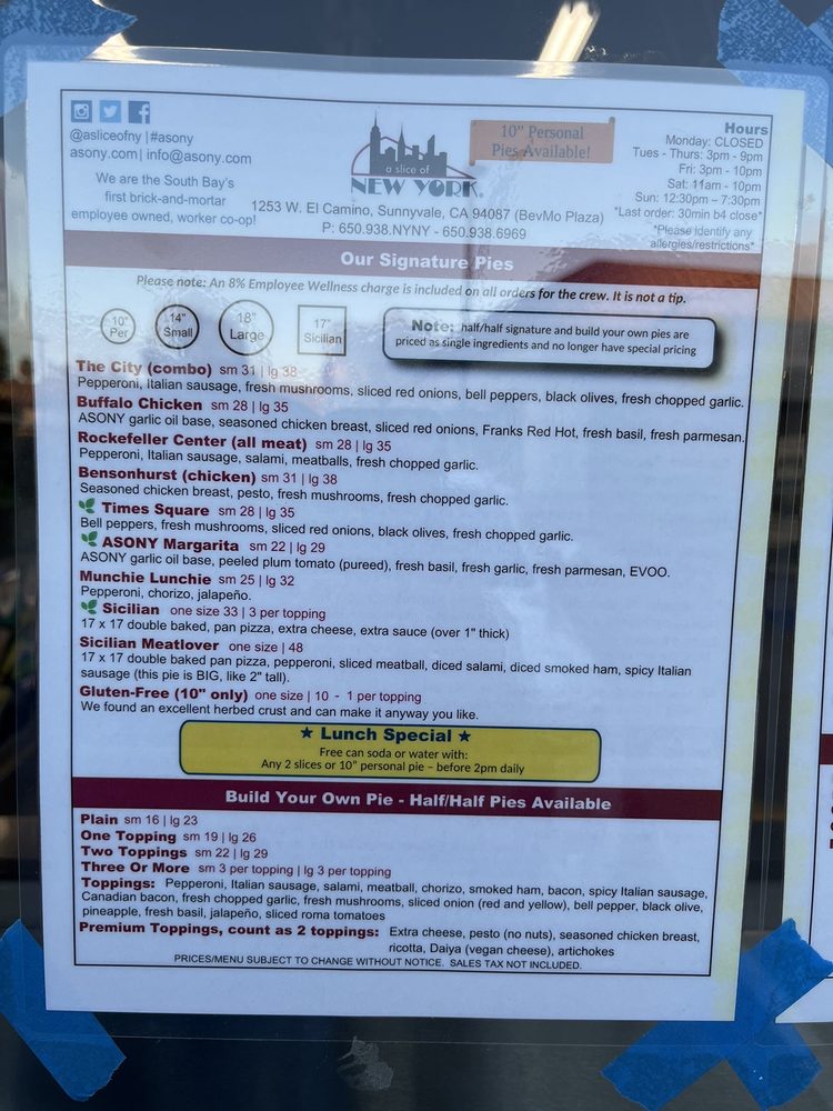 Introducing the menu at A Slice of New York, located in Sunnyvale, CA, offers a wide range of options including vegan and vegetarian choices. With a casual atmosphere, this Asian-owned establishment provides wheelchair accessibility, free Wi-Fi, and accepts various payment methods, including cryptocurrency. Customers rave about the delicious thin crust pizzas, flavorful toppings, and must-try garlic knots. The friendly staff and prompt service create a welcoming environment for diners looking to enjoy a slice or a full meal. Whether dining in, ordering for delivery, or taking advantage of their catering services, A Slice of New York aims to satisfy all pizza cravings with their quality ingredients and unique flavors.